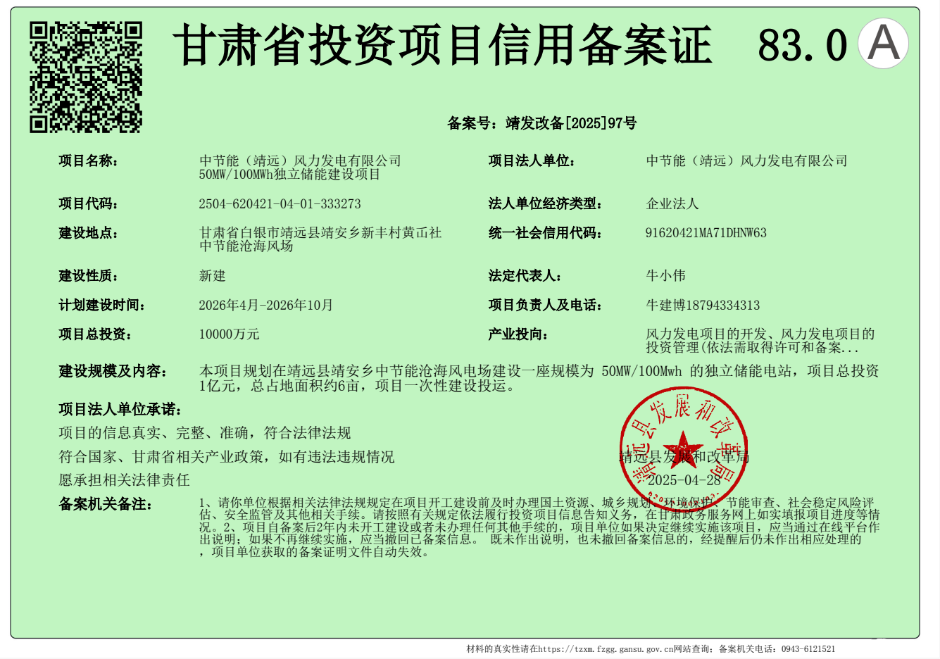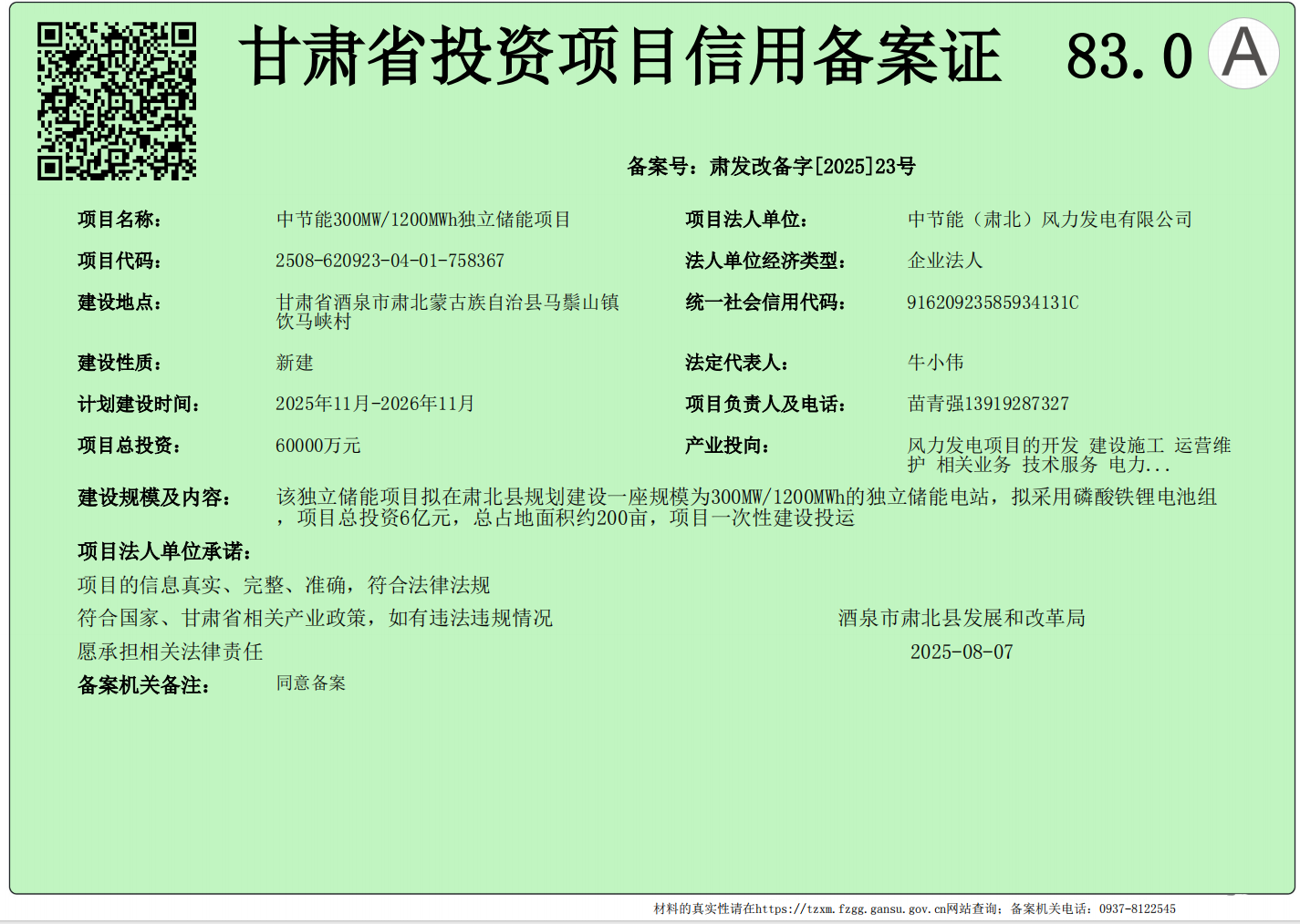 8月7日,風(fēng)電公司肅北縣300MW/1200MWh獨立儲能項目取得甘肅省酒泉市肅北縣發(fā)展和改革局下發(fā)的《甘肅省投資項目信用備案證》,是風(fēng)電公司積極探索“風(fēng)電+相關(guān)多元”開(kāi)拓新領(lǐng)域新業(yè)務(wù)的重要成果。