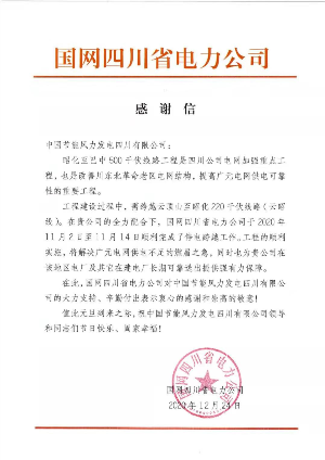 “國網(wǎng)四川省電力公司對中節能風(fēng)力發(fā)電四川有限公司的大力支持、辛勤付出表示衷心的感謝和崇高的敬意!值此元旦到來(lái)之際,祝中節能風(fēng)力發(fā)電四川有限公司領(lǐng)導和同志們節日快樂(lè )、闔家幸福!”這是在2021年元旦前夕,國網(wǎng)四川省電力公司送來(lái)的感謝信中的內容。四川省電力公司用熱情洋溢的語(yǔ)言表達了深深謝意和祝福,溫暖人心。